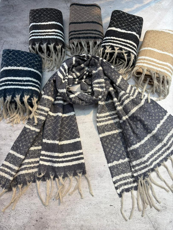 ریشههای فیتیلهای ظریف، جلوهای لوکس و مدرن به شال داده و آن را مناسب استفاده روزمره، استایلهای رسمی و نیمهرسمی میسازد.